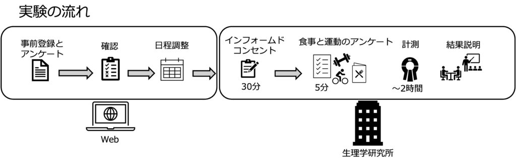 約2時間30分を予定しています。 (実験内容の説明、書類の記入、他:約30分、実験:2時間)